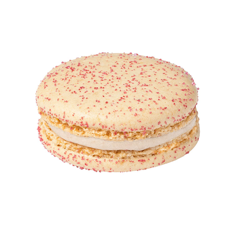 Two macaron shells sprinkled with crystal sugar, garnished with a smooth strawberry candy marshmallow