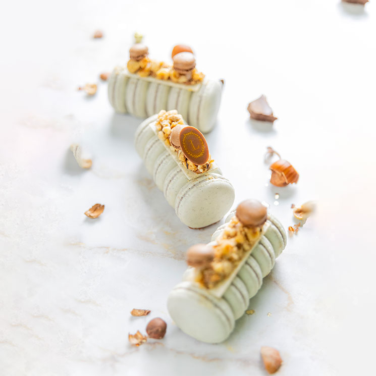 Crunchy hazelnut chocolate base, hazelnut sponge cake, hazelnut cream, flowing caramel delicately coated with a 62% Macaé chocolate chantilly and a 40% Jivara chocolate and hazelnut glaze. Only available in Ladurée Cafés.