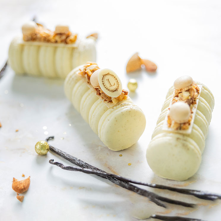 This yule log is composed of a soft almond sponge cake on a crispy base, a flowing salted caramel and almond praline center, light vanilla cream, and a chocolate-vanilla shell. It is topped with a golden macaron shell.